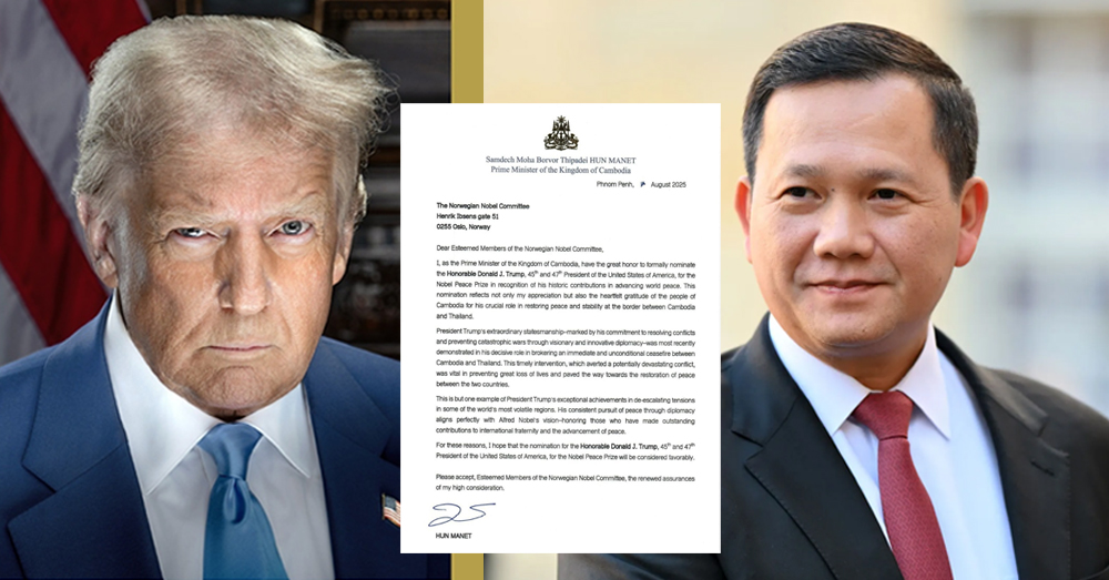 In a formal letter addressed to the Norwegian Nobel Committee today, Prime Minister Hun Manet praised Trump’s “extraordinary statesmanship” and credited the former president for brokering an immediate and unconditional ceasefire between Cambodia and Thailand—an intervention the Cambodian leader described as having “averted a potentially devastating conflict.”